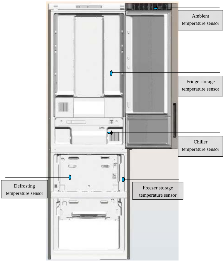 | F SNR | F4 | Ошибка датчика температуры морозильной камеры (короткое замыкание или обрыв цепи) | Воздуховод морозильной камеры |