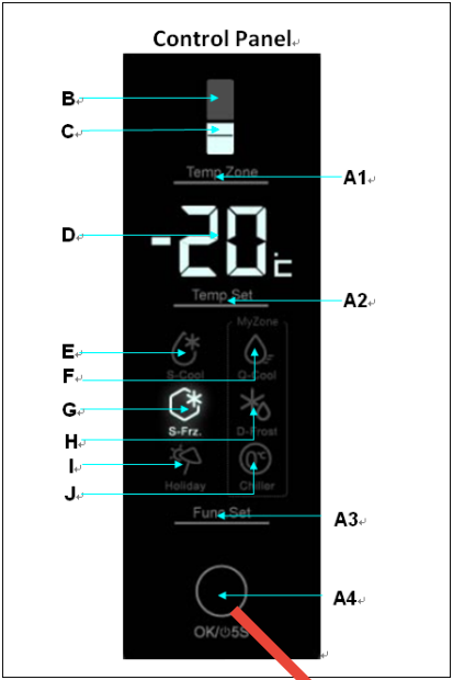Метод входа: Откройте дверцу холодильника. После того как панель дисплея загорится, нажмите клавишу «Temp Zone» и одновременно нажмите клавишу «Temp Set» 5 раз, чтобы войти в режим отображения кода неисправности и показаний датчиков температуры. После входа в этот режим в области отображения температуры будет показан код неисправности согласно уровню приоритета отображения. Нажмите кнопку «Temp Set», чтобы показать следующий код. После отображения кода неисправности последующие нажатия кнопки «Temp Set» будут поочерёдно показывать фактические температуры датчиков: