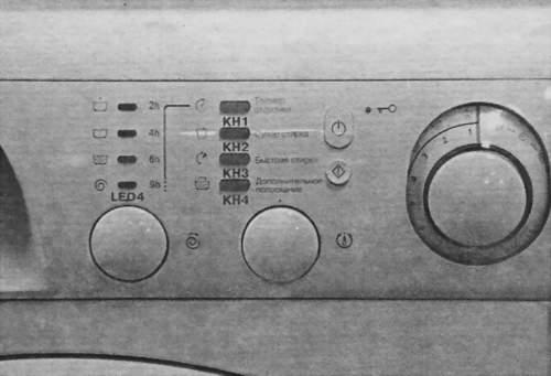 Коды ошибок в этом случае считываются по свечению индикатора ОТЖИМ (LED 4) и подсветки кнопок ТАЙМЕР ОТСРОЧКИ (КН 1), СУПЕР СТИРКА (КН 2), БЫСТРАЯСТИРКА (КН 3) и ДОПОЛНИТЕЛЬНОЕ ПОЛОСКАНИЕ (КН 4).