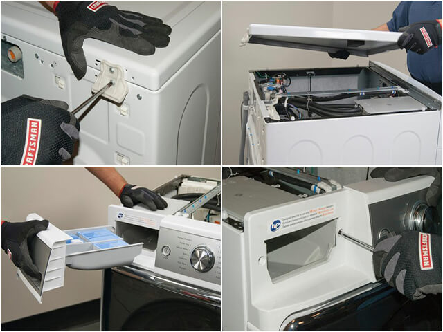 - Вытаскиваем лоток для порошка на себя до упора, нажимаем на пластиковый язычок в центре и вынимаем порошкоприемник полностью.